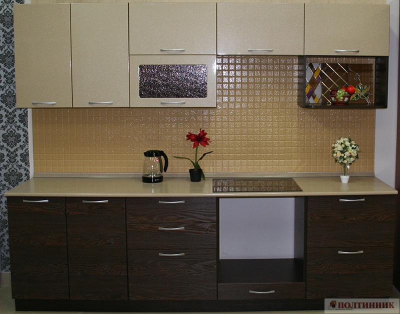 Фасады :МДФ+пленка ПВХ Столешница постформинг 28 мм Размер 2600мм Цена кухонного гарнитура от 30.390 руб Любой кухонный гарнитур можно приобрести с фартуком МДФ с фотопечатью Полноцветные панели из МДФ с фотопечатью — это материал, который используется для декорирования «рабочей стены» на кухне. Панели прочны и не боятся влаги и пара. Основные преимущества: — Бюджетный аналог фартукам из стекла; — Хороший выбор; — Очень просто монтируются; — Глянцевое, долговечное покрытие; — Хорошая сопротивляемость к появлению царапин; — Выдерживают высокие температуры; — Не боятся химических моющих средств; — Очень долго не выцветают на солнце