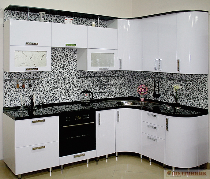 Фасады :МДФ+пленка ПВХ Столешница постформинг 38мм влагостойкая Размер 2400мм*1600мм Цена кухонного гарнитура от 56.309 руб Гнутые фасады не только имеют оригинальный внешний вид, они также практичны в использовании. Например, радиусная торцевая часть кухонного гарнитура возле дверного проема позволит избежать ушибов и травм, благодаря отсутствию острых углов и сделать кухню максимально эргономичной. Чтобы создать особенную обстановку на кухне, дизайнеры рекомендуют использовать для отделки фасадов МДФ с пленкой ПВХ за счет богатой цветовой палитры такой вариант станет беспроигрышным благодаря оригинальной форме фасадов.